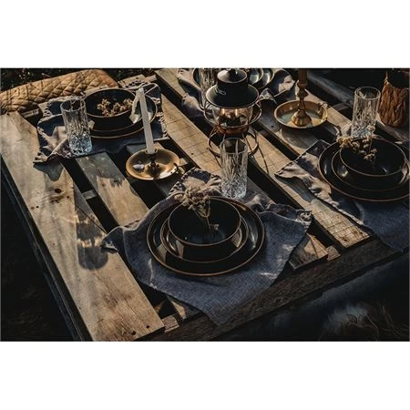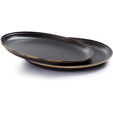 Model – BARE341. Barebones Living Enamel Plate Set. Dishwasher safe. Set of two. 11″ diameter. Steel core with charcoal enamel finish and antique copper-like detailing. Raised edges. Indoor and outdoor use. Vintage-inspired design. Boxed with hanging tab. Made in China.