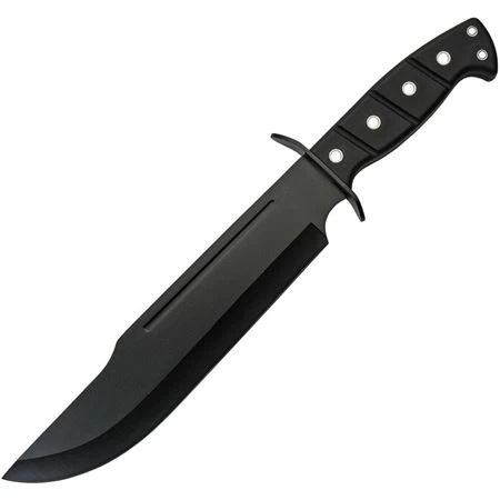 Model – CN211514PL. China Made 211514PL – Backyard Bowie. 15″ (38.1cm) overall. 10″ (25.4cm) black finish 420 stainless clip point blade. Black rubberized ABS handle. Stainless guard. Lanyard hole. Full tang. Black nylon belt sheath. Boxed. Made in China.