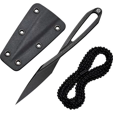 Model – CIVC210012. Civivi D-Art Neck Knife Black SW. 5″ (12.7cm) overall. 1.75″ (4.45cm) black stonewash finish D2 tool steel blade. One-piece construction. Ball chain lanyard. Black Kydex sheath. Boxed. Made in China.