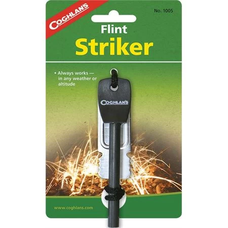 Model – CGN1005. Flint Striker. 4.13 inch overall. Ferrocerium rod with synthetic handle, striker, and cord lanyard. Lasts for thousands of strikes. Works in any weather or altitude. Hang packaged.