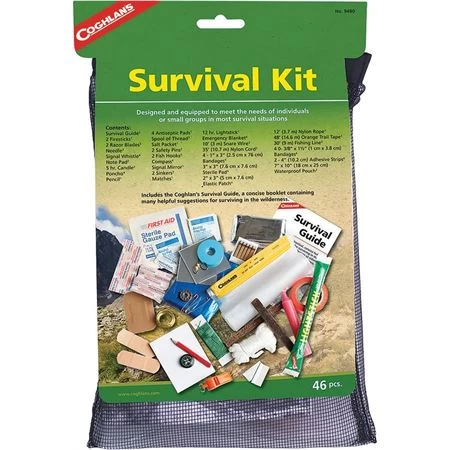 - Includes: Survival guide; (2) firesticks; (2) razor blades; needle; signal whistle; note pad; Five hour candle; Poncho; Pencil; (4) antiseptic pads; Spool of thread; (2) safety pins; (2) fish hooks; Compass; Signal mirror; (2) Sinkers; Matches; 12 hour lightstick; Emergency blanket; 10 foot snare wire; 35 foot nylon cord; (4) 1″ x 3″ bandages; 3″ x 3″ sterile pad; 2″ x 3″ elastic patch; 12 foot nylon rope; 48 foot orange trail tape; 30 foot fishing line; (40) 0.38″ x 1.5″ bandages; (2) 4″ adhesive strips; 7″ x 10″ waterproof pouch