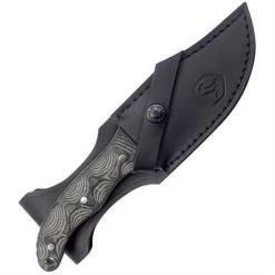 Model – CTK182145HC. Little Bowie. 9.5 inch (24.13cm) overall. 4.63 inch (11.76cm) blasted satin finish 1075HC steel clip point blade. Black and gray micarta handle. Full tang. Lanyard hole. Black leather belt sheath. Boxed.