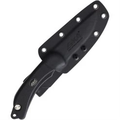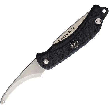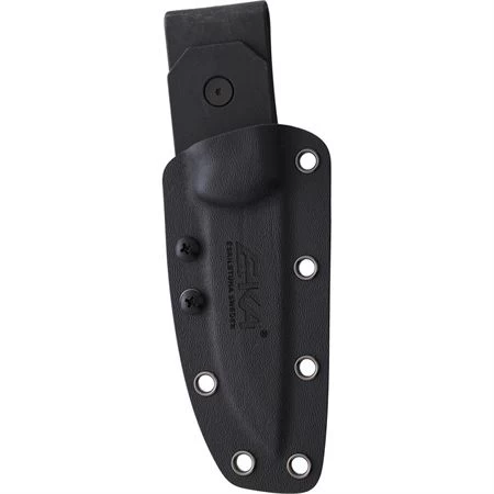 Model/Part Number – EKA317308. EKA Sweden Knives Swedblade G4 Black. 8.75″ (22.23cm) overall. Satin finish 12C27 Sandvik stainless blade. Black rubber handle. Lanyard hole. Push button to switch between utility blade and gut blade. Black molded plastic belt sheath. Boxed. Made in Sweden.