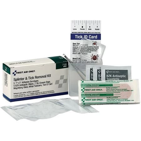 - Includes: (5) 1″ x 3″ adhesive bandages; (5) BZK antiseptic wipes; (2) Zip closure bags; Magnifying glass; Metal tweezers; Tick ID card