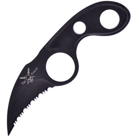 Model – FTA079. Neck Knife. Tac Assault. 5.5 inch overall. 2.25 inch black finish serrated stainless hawkbill blade. Black smooth ABS handle. Finger ring. Full tang. Black molded plastic neck sheath. Boxed.