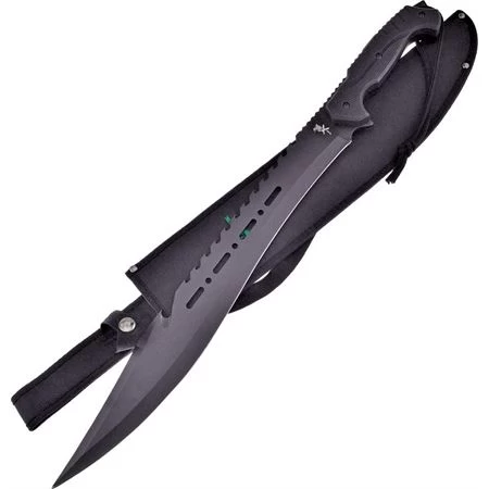Model – FTX481BK. Machete. Tac Xtreme. 25 inch overall. 17.5 inch black finish stainless blade. Black rubberized ABS handle. Full, extended tang. Glass breaker. Lanyard hole. Sawback blade. Black nylon belt sheath. Boxed.