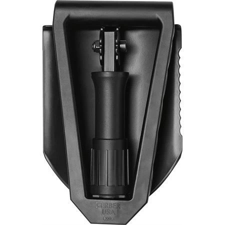 Model – G5942. Entrenching Tool with Aluminum Shaft with Glass-Filled Nylon Handle. 23.75 inch overall. 9.5 inch closed. Black powder coated boron carbon steel spade with serrated cutting edge. 7075 aluminum shaft with glass-filled nylon handle. No sheath. Proudly made in the USA.