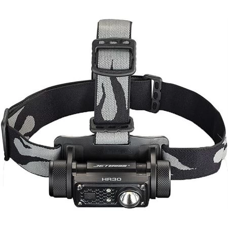 Model – JETHR30. HR30 Headlamp. Dimensions: 3.42 inch x 1.75 inch x 1.8 inch. Clip. Water resistant. Impact resistant. 160 degree rotatable design. Red and white dual light sources. Modes: Turbo (950 lumens, 4h runtime), High (400 lumens, 3.8h runtime), Mid (150 lumens, 10.5h runtime), Low (50 lumens, 30h runtime), Eco (5 lumens, 30h runtime), Red (1 lumen, 100h runtime). 120m beam distance. Also compatible with 20700 Li-Ion battery. Front single switch function. Low power warning function. Tail magnet. Ergonomic bracket design. Requires (1) 18650 battery (not included), or (2) CR123A batteries (not included). Metal construction. Color: Black. Boxed with hanging tab.