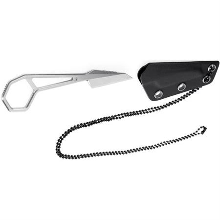 Model/Part Number – KG0001A1. Kansept Hex Neck Knife SW. 5.63″ (14.3cm) overall. 2″ (5.08cm) stonewash finish 14C28N Sandvik stainless blade. One-piece construction. Finger ring. Ball chain lanyard. Black Kydex neck sheath. Boxed. Made in China.