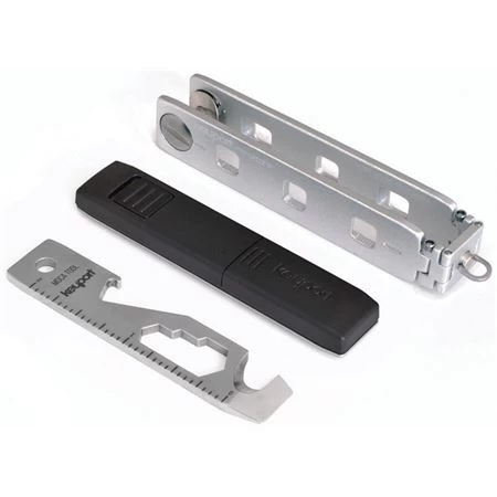 Model – KYP431. Pivot Essential Bundle Silver. Silver aluminum handle. Tools include: Ruler l Wrench l Small screwdriver l Hex/Bit driver l Belt/cord cutter. Includes: Keyport Pivot; MOCA multitool; mini flashlight module. Boxed with hanging tab. Made in China