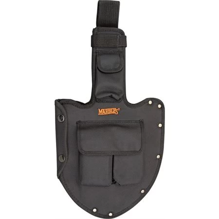 Model – MR5015S. Marbles 5015S – Fireman’s Shovel Machete Sheath with Heavy Black Nylon Construction. Heavy black nylon construction with orange embroidered Marble’s logo and belt loop. Features two cargo pouches plus a pouch with included sharpening stone. Made to fit MR5015 Fireman’s Shovel Machete. Bulk packed. Made in China.
