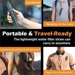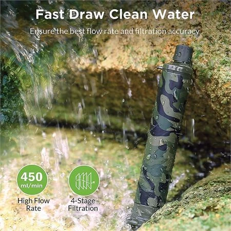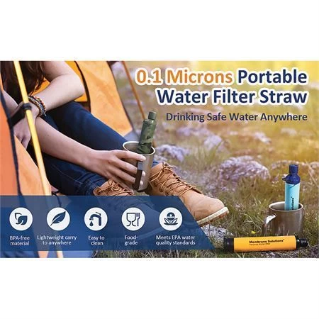 Model – MSLOESF001. Membrane Solutions Water Filter Straw Camo. Removes up to 99.9999% bacteria and 99.99% protozoan cysts. Remove particles as small as 0.1 micron. BPA free materials. Cord lanyard. Color: Camo. Boxed. Made in China.
