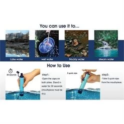 Model – MSLOESF002. Membrane Solutions Water Filter Straw Blue. Removes up to 99.9999% bacteria and 99.99% protozoan cysts. Remove particles as small as 0.1 micron. BPA free materials. Cord lanyard. Color: Blue. Boxed. Made in China.