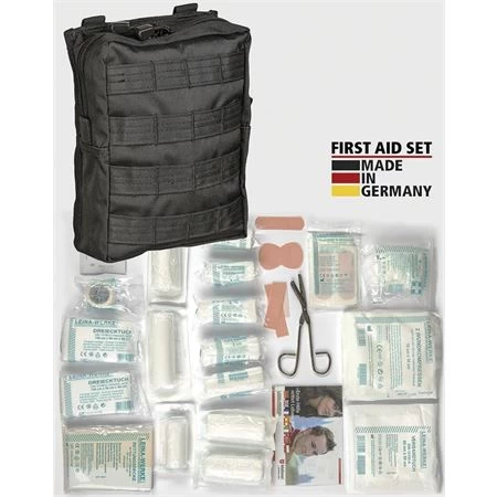 Model – M4381. First Aid Kit Bk MOLLE Pouch. Contains: Assorted emergency bandages, scissors, four pair vinyl gloves, assorted sizes fixative bandages, rescue blanket, triangular bandages, tape, cleansing wipes, assorted sizes gauze dressing, compression bandages, and emergency instruction manual. Black nylon MOLLE compatible belt sheath. Bulk packed.
