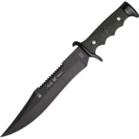 Model – NIE3003. Nieto 3003 – Cuchillo Linea Combate Fixed Blade Knife. 13 3/4″ overall. 9″ blade. Fighting/Combat knife. AN-58 steel sawback bowie blade. Full tang. Checkered olive green ABS handles. Black finish Zamak steel guard, pommel, and trim. Inlay shield. Camouflage fabric belt sheath. Made in Spain.