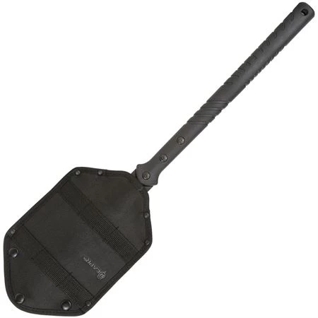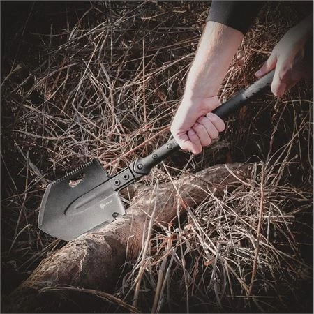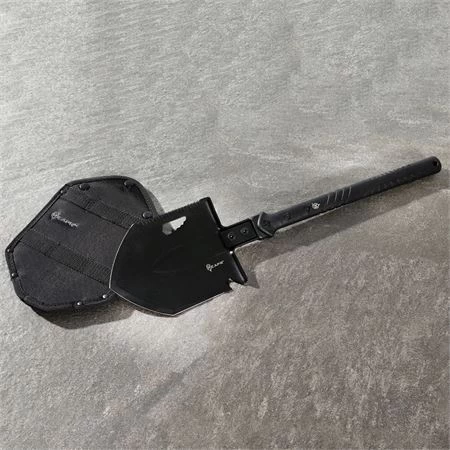 - 7.5″ wide black powder coated 420 stainless shovel end with saw edge and belt/cord cutter