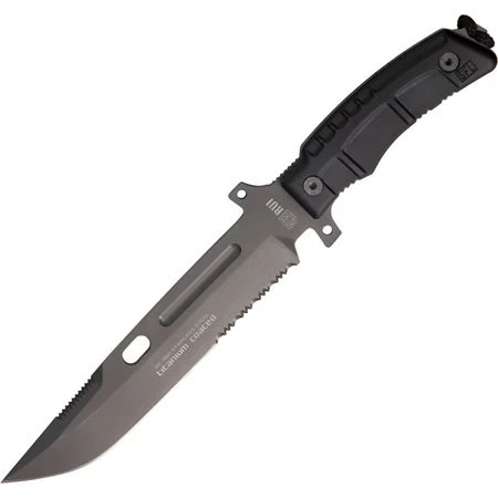 - 7 3/4″ titanium coated stainless partially serrated blade with partially serrated top edge