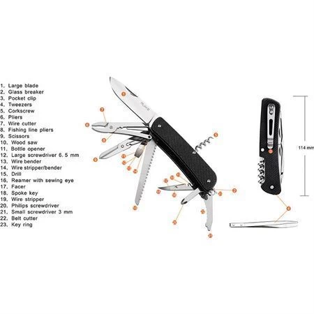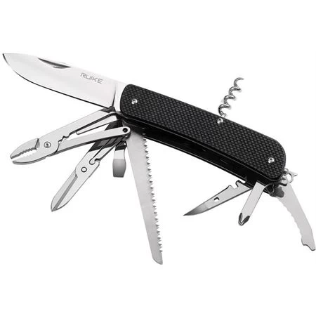 Model – RKELD51B. RUIKE LD51B – LD51 Multifunctional Knife with Black G10 Handle. 4.5″ closed. Black G10 handle. Tools include: Large blade l Pliers l Wire cutter l Needlenose pliers l Wire crimper l Bottle opener l Large screwdriver l Wire stripper l Saw blade l Wrench l Reamer with sewing eye l Phillips screwdriver l Belt/cord cutter l Small screwdriver l Pocket clip l Corkscrew l Glass breaker l Keyring l Tweezers. Facer. Drill. Stainless tools. Boxed. Made in China.
