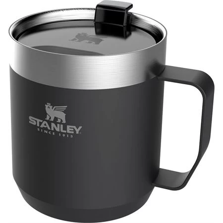 Model – STA9366002. Stanley 9366002 – The Legendary Camp Mug. Dishwasher safe. 12 oz capacity. Keeps contents hot 1.5 hours, cold 3 hours, and iced 15 hours. Double wall vacuum insulation. Tritan drink-thru lid. 18/8 stainless construction. Color: Black. Bulk packed. Made in China.