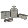 Model – UCO00384. Camp Cup Single Venture. Dishwasher safe. 12 fl. oz. capacity. Flexible base collapses inside rigid upper to reduce the overall height by 50%. Ergonomic handle. Integrated attachment point compatible with common carabiner sizes. Built in volume gradients (oz and ml). Safe for boiling liquids. FDA food safe. BPA-free. Phthalate free. Color: Black and gray. Polypropylene construction. Bulk packed.