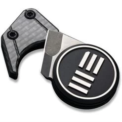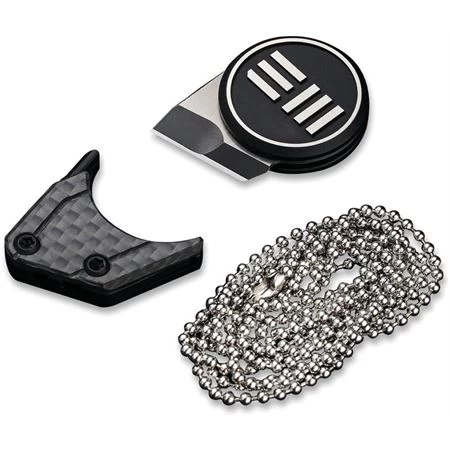 Model – WE200212. We 200212 – Quark. 1.5″ (3.81cm) overall. 0.25″ (.64cm) black stonewash and satin finish Bohler M390 stainless blade. Black titanium handle. Lanyard hole. Blade cover with twill carbon fiber front and black titanium back. Silver WE logo on handle. Ball chain lanyard. Boxed. Made in China.