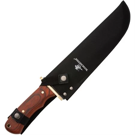 Model/Part Number – WN6220001W. Winchester Knives Bowie Wood. 14″ (35.56cm) overall. 8.75″ (22.23cm) satin finish stainless bowie blade. Brown wood handle. Brass guard. Lanyard hole. Black nylon belt sheath. Clam packed. Made in China.
