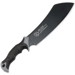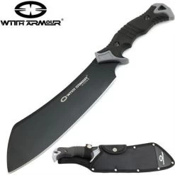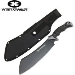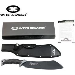 Model – WAR1031. WithArmour 1031 – Soldier Machete. 15″ (38.1cm) overall. 9″ (22.86cm) black coated 440 stainless blade. Black TPR handle. Lanyard hole. Black nylon belt sheath. Boxed. Made in China.