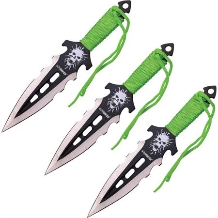 Model – ZB1353. Z-Hunter 1353 – Thrower Set Fixed Blade Knife. Includes three 7 1/2″ overall throwing knives with 4″ two-tone black and matte finish stainless double edge blade. Top portion of blade features white zombie head artwork. Full, extended tang with pointed pommel and lanyard hole. Neon green cord wrapped handle. Neon green cord lanyard. Black nylon belt sheath holds all. Made in China.